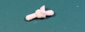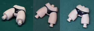 | 24 | 腹関節を取り付けます。これで、腰パーツが固定されます。 (接着の必要はありません) 腹関節が緩い場合があります。 その際は 72項を参考に調整してください。 お腹パーツを茹でて画像を参考に差し込みます。 画像はサムネイルです。クリックすると大きい画像で表示します。 |