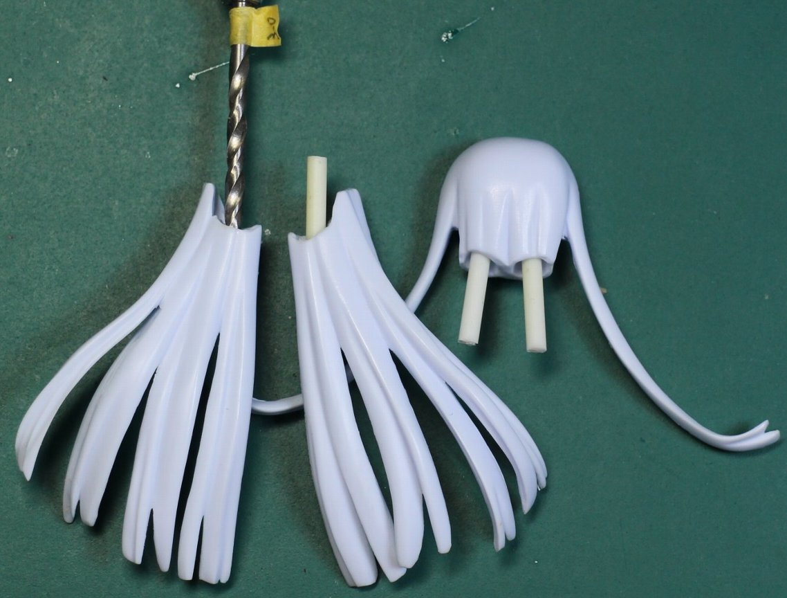 | 51 | 髪は3.0ミリのドリルで穴を開けて可動軸で繋ぎます。 角度にコツがいりますので 52項〜54項を確認してから、穴を開けてください 画像はサムネイルです。クリックすると大きい画像で表示します。 |