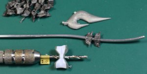 | 67 | 尻尾パーツに2ミリの穴を開けて、アルミ線に通します。 数が多いので、2ミリドリルで直接空けてもOKです。 画像はサムネイルです。クリックすると大きい画像で表示します。 |